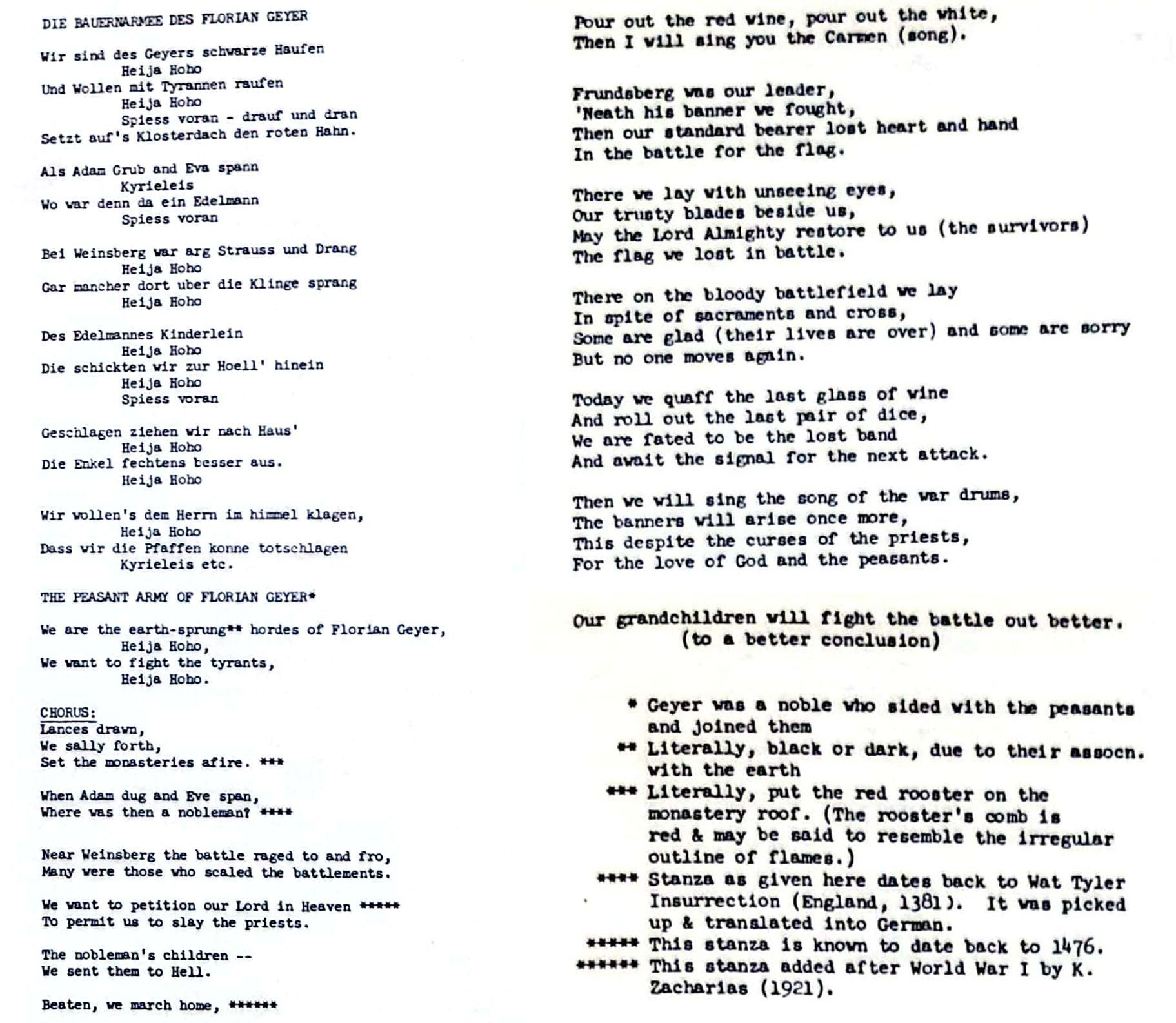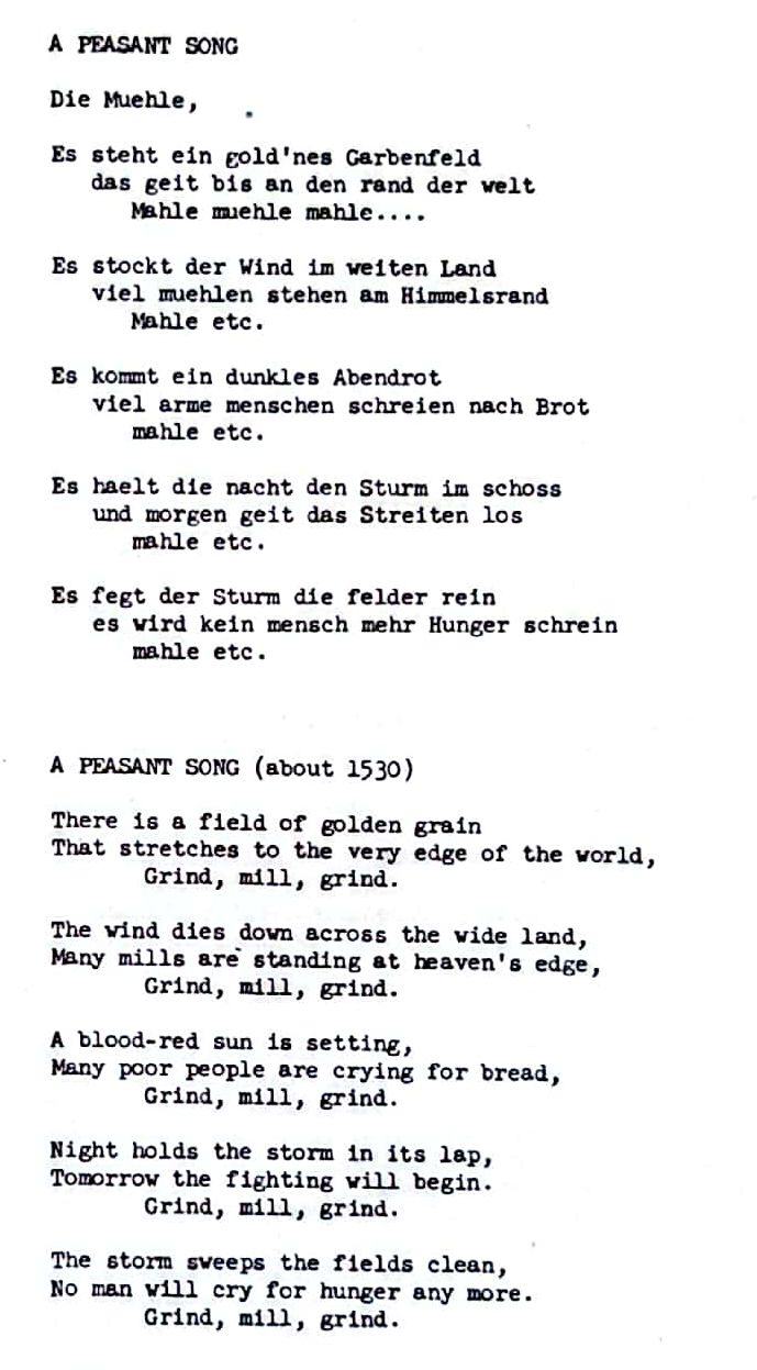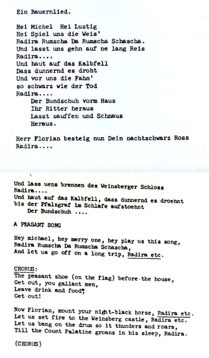 Ce disque c'est des vieilles chansons en allemand du 16ème siècle environ et nottament y en a plusieurs qui parlent de la révolte des paysans de 1525 (500 ans l'an dernier) ou des masses de paysans se sont motivés à cramer les monastères et les châteaux des nobles pour s'en mettre plein la panse, c'était en allemagne actuelle, en alsace actuelle et encore ailleurs. Ca s'appelait Bundschuh qui veut dire la chaussure à liens ou chaussures à lacets et ils avaient des drapeaux avec une chaussure à lacet dessus. C'était les chaussures portées par les paysans. Certains y voient aussi une revendication de 'lien' ou de solidarité entre paysans.